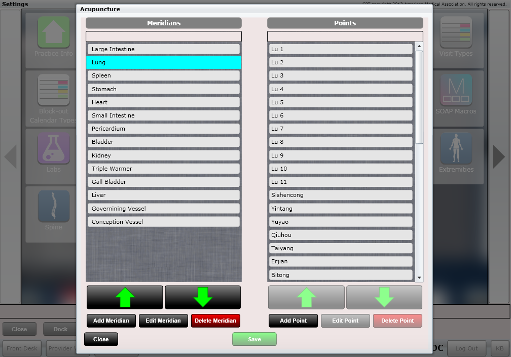 Meridans and Points are all fully loaded for you "out of the box". You will be documenting your patient's acupuncture visit on day 1.