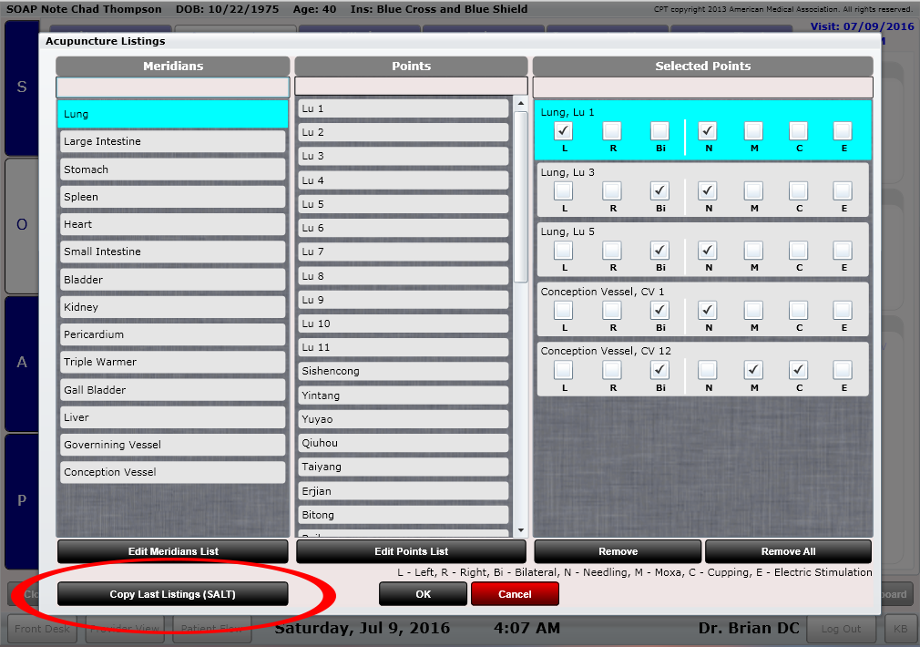 Use ChiroSpring’s built-in SALT (Same as Last) button to copy the acupuncture listings from the previous visit to today. Then make only the changes you need for this visit. It's that easy.