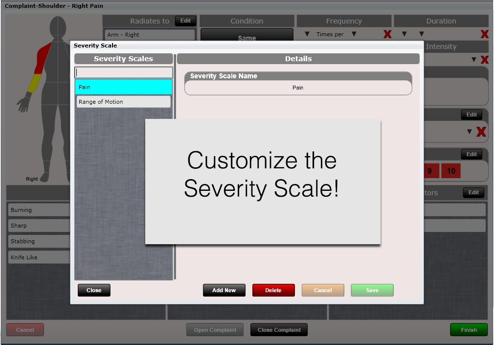Complaints can easily be closed when complete, and progress is shown in real time on the complaint severity scale graph. The severity scale is customizable and can be used to track pain, range of motion or numbness, among others.