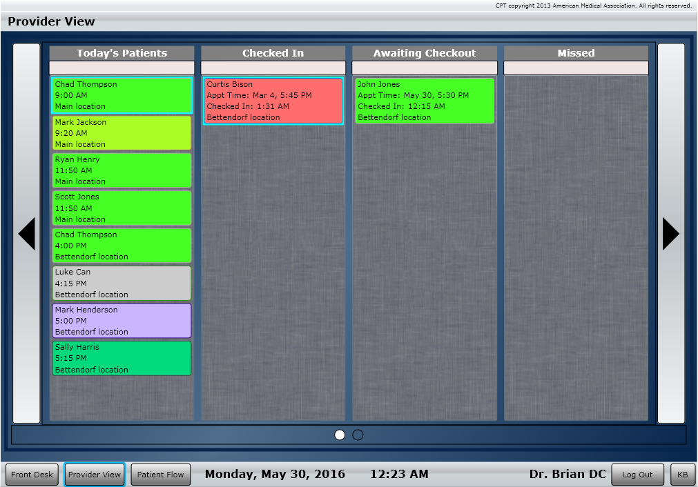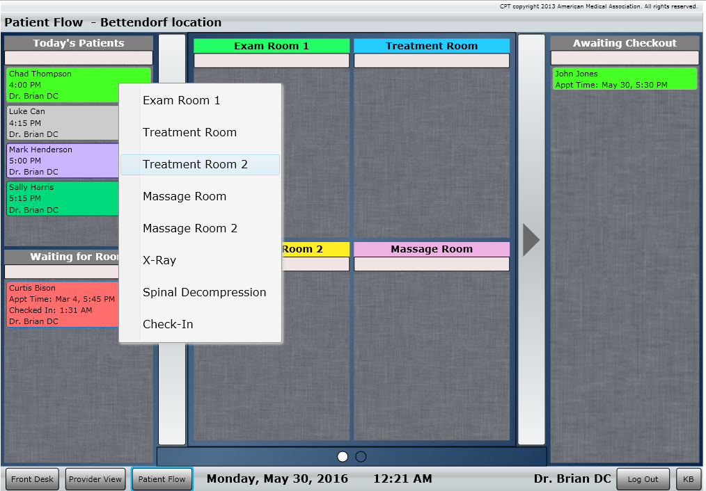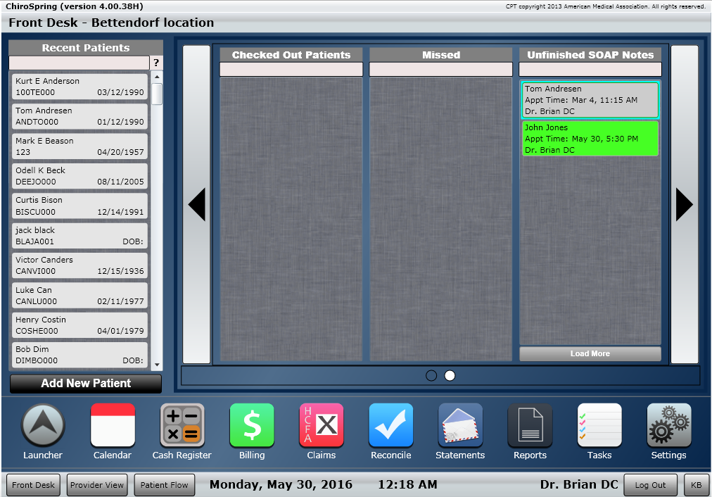 In addition to the capabilities of the Front Desk feature, a list of powerful additional Apps are displayed on the screen’s bottom panel. These Apps include the Calendar, Cash Register, Billing, Claims, Reconciliation, Statements, Reports, Tasks and Settings. Everything you need is right at your fingertips with ChiroSpring’s Front Desk.