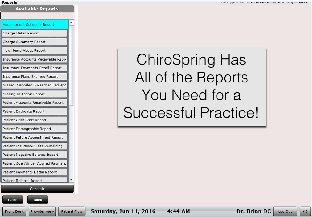 ChiroSpring's Reports app is available on the Front Desk and contains a wealth of useful reports that are beneficial to running a successful practice.