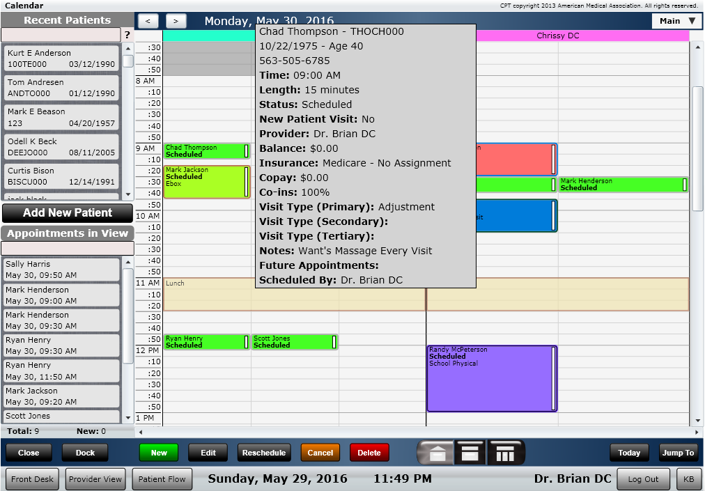 Hover over any appointment to reveal details such as account balance, future appointments or even phone number to name a few.