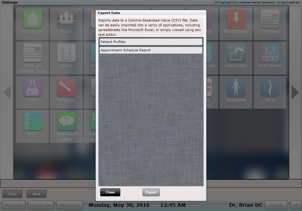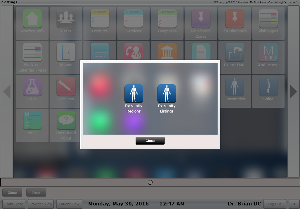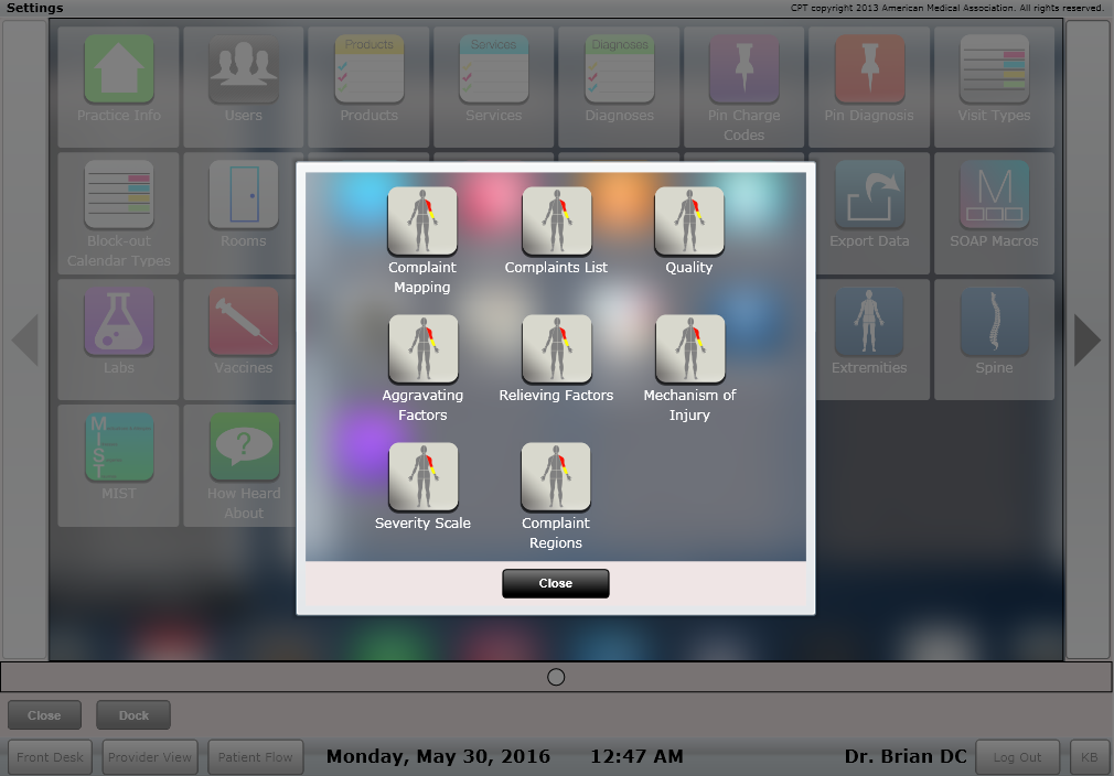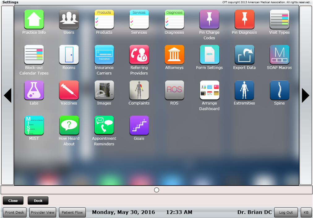 The ChiroSpring Settings app offers a world of additional functionality that allows practices the ability to fine-tune the software to their unique preferences. ChiroSpring gives doctors the flexibility to make dozens of customizations, including: create their very own SOAP Macros, re-arrange the order of their SOAP Macro grid, customize their calendar, add additional practices, create custom receipts, add patient statement footers and so much more.